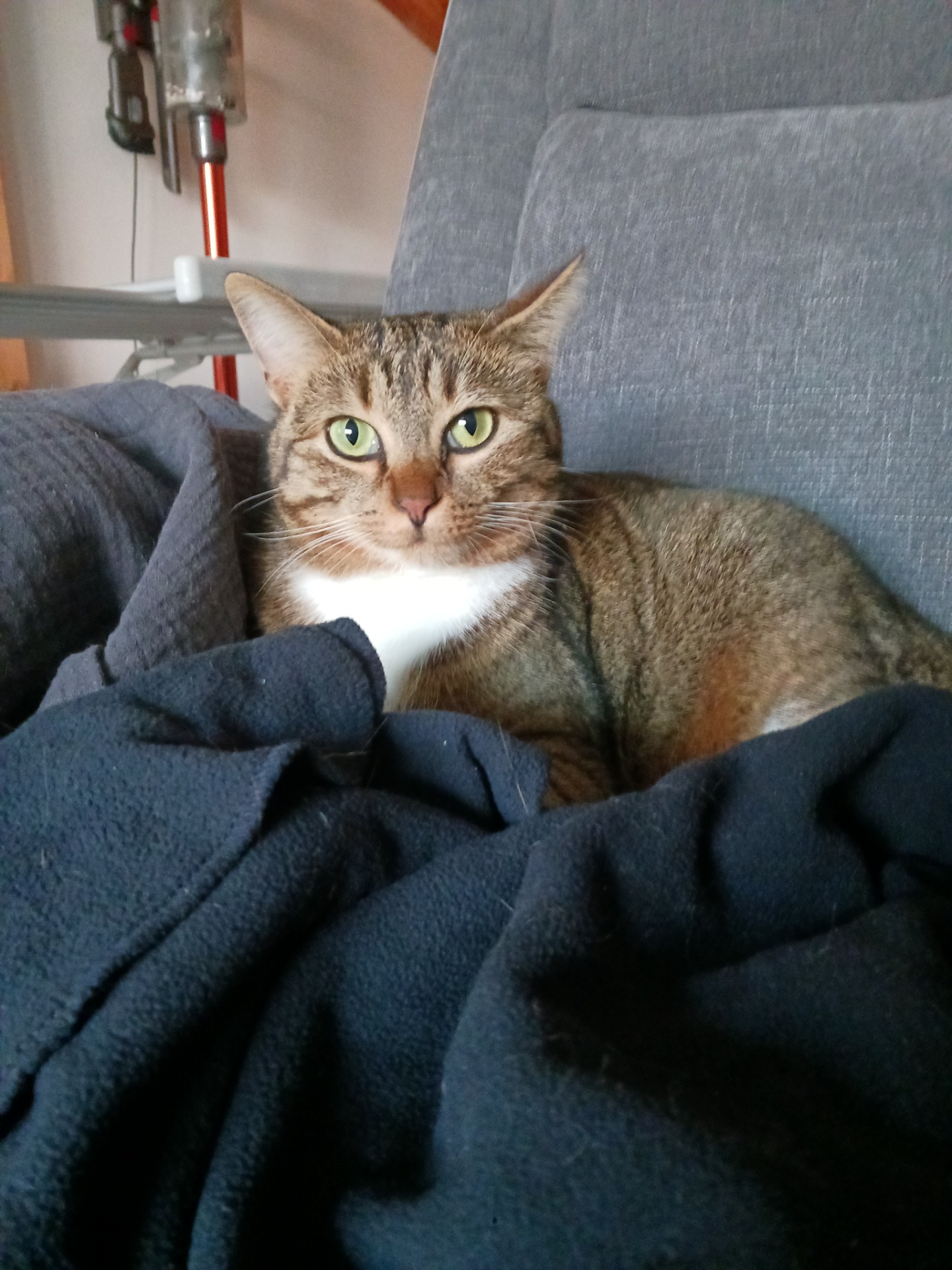Maintenant, Bella reste et dort à la maison, même si elle demande à sortir, comme avant et surtout recommence petit à petit à dormir avec nous en sachant que Tango peut rentrer dans la chambre à tout moment. Elle dort à nouveau dans son arbre à chat sur sa couverture rose pale.